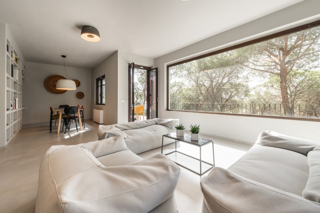 • 🌲 Spacious and bright living area with views of the pine forest, cozy for relaxing or reading.